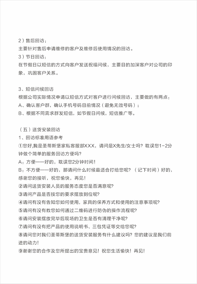 话术参考:“**先生/女士您好,我是多多28的售后服务人员**,您购买的多多28家具已经全部到货了,送货安装大约需要**时间,请问您这边什么时候方便我们上门送货安装呢?”同时要了解送货小区的电梯、楼道、入户门的尺寸等,提前做好准备,避免意外情况。最后确定送货时间(安装所需要时长),并告知客户安装人员的相关信息,可加微信发送,并发送配送安装流程说明。